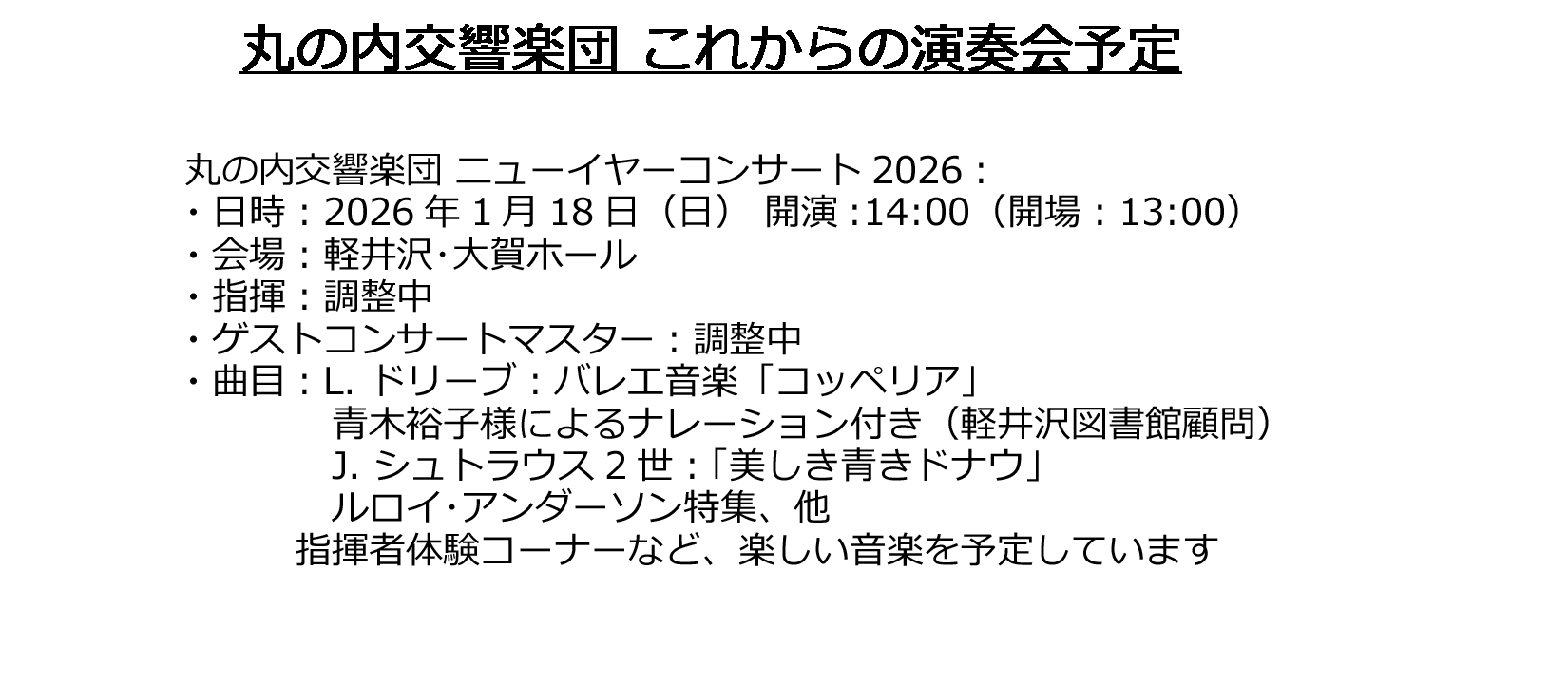 指揮者体験コーナーなど、楽しい音楽を予定しています。